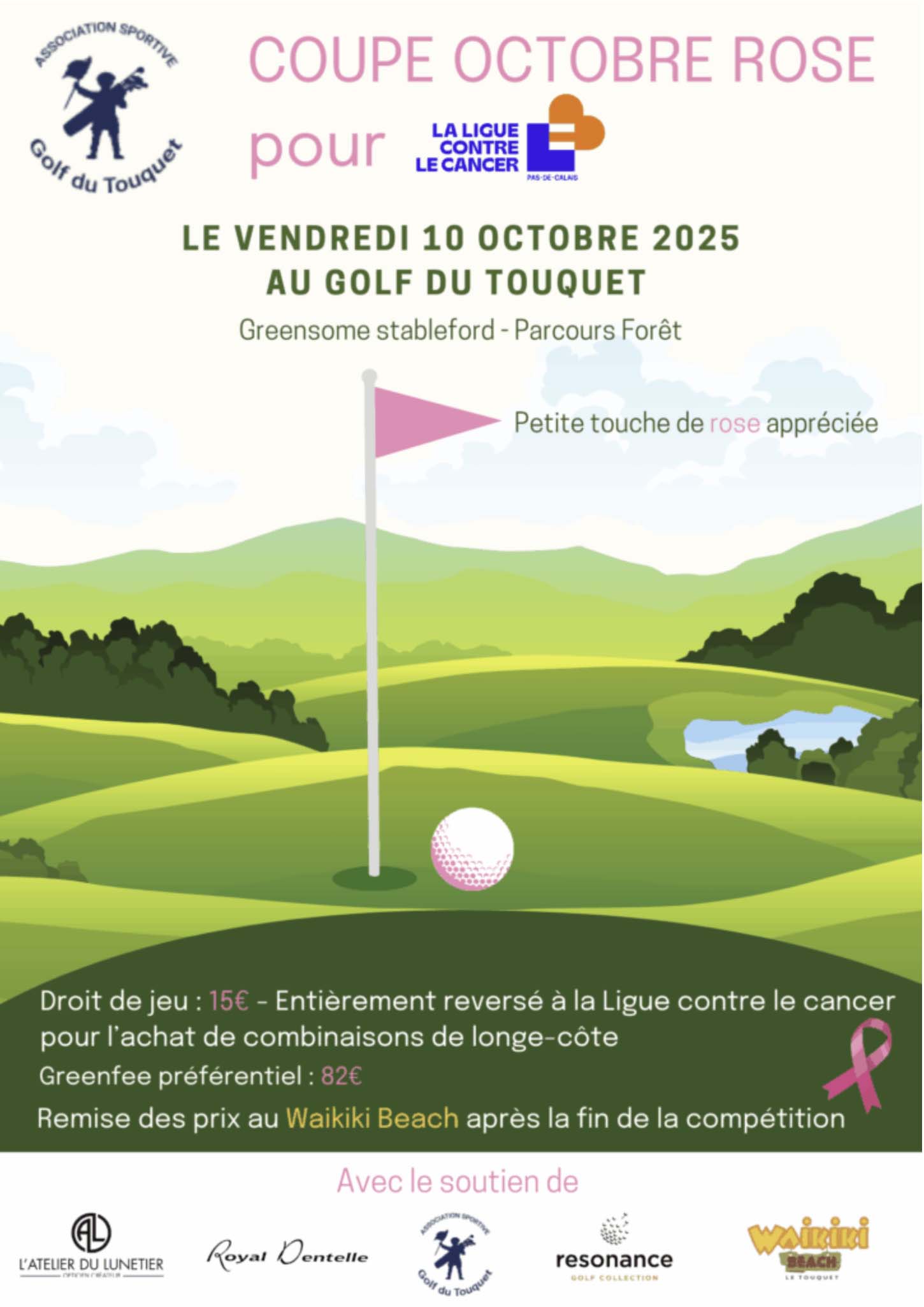 Le 10 octobre, coupe de golf octobre rose au golf du touquet. Fonds entièrement reversés à la Ligue contre le cancer du Pas-de-Calais pour financer l’achat de combinaisons de longe-côte, dans le cadre du projet de création d’une unité MPR à Berck.